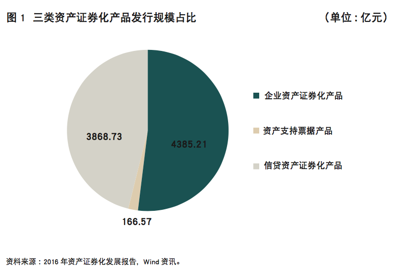 2016年企业资产证券化产品发行规模环比增长一倍,成为2016年体量最大的资产证券化业务品种。从2016年发行占比上看,2016年信贷资产证券化产品、企业资产证券化产品、资产支持票据共发行8420.51亿元,三大产品发行量分别为4385.21亿元、3868.73亿元、166.57亿元,分别占比45.94%、52.08%、1.98%。企业资产证券化产品发行量首次跃居资产证券化产品发行量首位(见图1)。