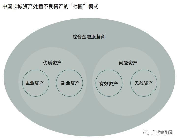 近期,中国长城资产又与某大型国有企业签署合作框架协议,将运用综合化金融服务手段,采取“七圈”模式,以不良债权收购为切入点,通过“基金介入——债务重组——资产重组——反向债转股(反向债转股是以转股为目的进行收购,先以承接债务为切入点,再择机将债权转股权)——借壳上市”对其实施一揽子重组,在大型企业集团并购重组领域形成新的优势。