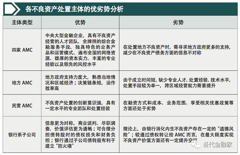 三是综合性不良资产处置主体以四家AMC为主。四家AMC培养和引进了一批既熟悉投资银行业务又熟悉商业银行业务的专业人才,在不良资产经营、管理、处置方面积累了丰富的经验,形成了独特的不良资产尽职调查体系和不良资产估值模型与方法,创新不良资产处置手段,专业优势突出,已发展成为具有银行、证券、基金、信托、保险、租赁等“全牌照”的金融控股集团,机构遍布全国各地,兼具“专业性”和“区域性”特点,在盘活存量资产、优化资源配置方面具有 “综合性”优势。